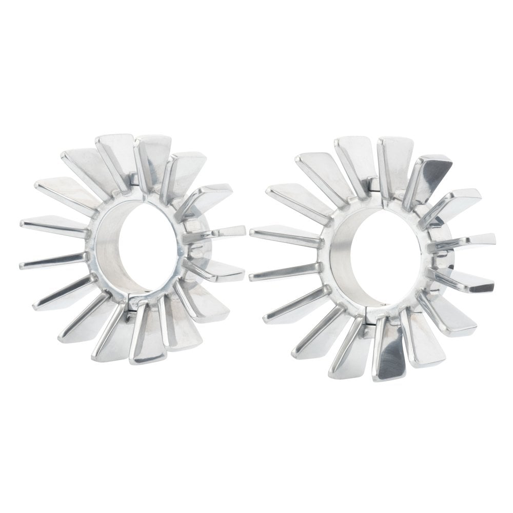 Motone Big Fin Exhaust Clamps for Triumph Twins. These clamps are made in cast aluminum in 2 pieces to fit around the top of the header as it is bolted on to the cylinder exhaust stub.